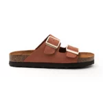 Handmade anatomic sandals. 100% nubuk leather upper stripes and suede leather insole. Open-toe design with adjustable buckles. 80% recycled PVC.